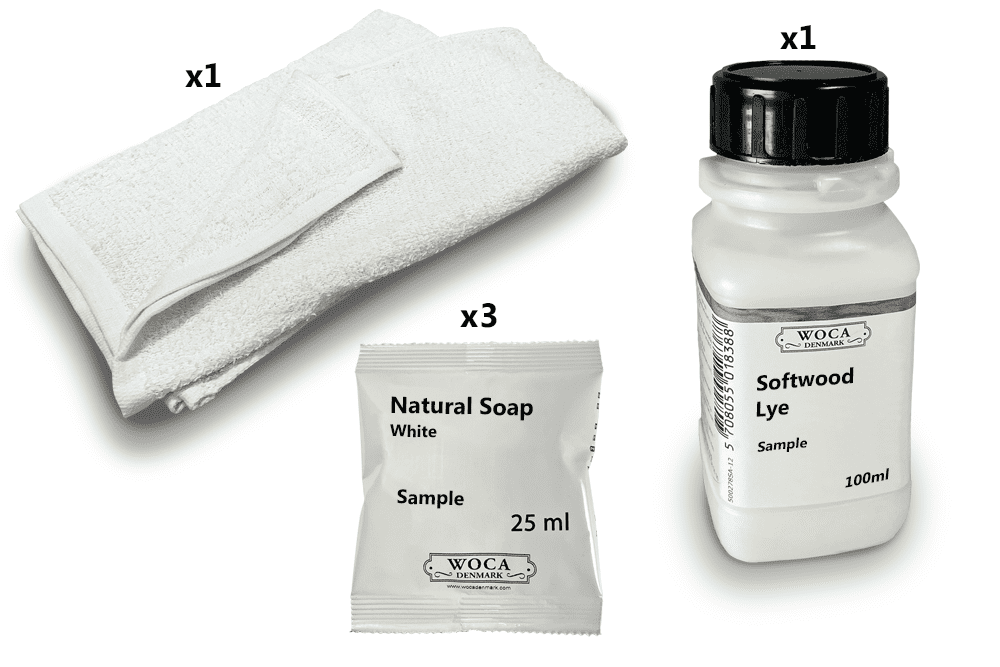 Kit sample, Prepare Woca Softwood Lye, Soap finish Woca white Soap DC011