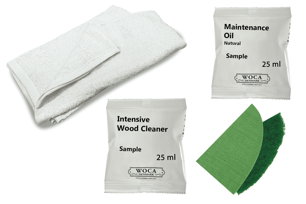 Kit samples, Deep clean & then reoil an aged floor with natural Woca Maintenance Oil. DC047 & DC046